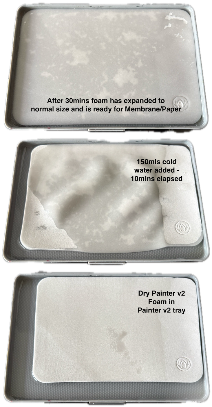 If you receive a new foam pad that has dried out, you can easily rehydrate the foam by submerging it in cold water for 20-30 minutes or by holding it under cold running water and gently massaging it with your hands as it begins to absorb moisture. Once softened you can then continue to setup your wet palette as normal.